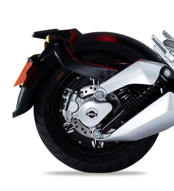 La motocicleta eléctrica Miku Super dispone de un sistema de frenos en ruedas delanteras y traseras, amortiguador hidráulico frontal y trasero para una conducción más estable y flexible en caminos más movedizos.